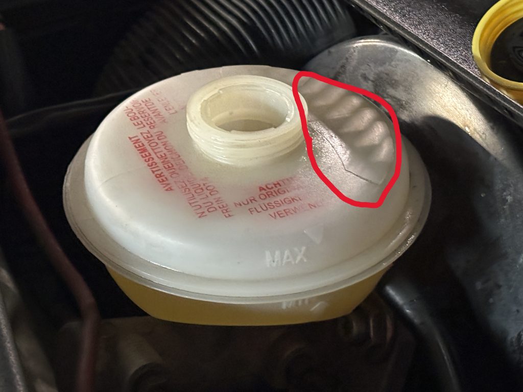 Den Bremssattel habe ich beim Schrauber meines Vertrauens inklusive des Bremsschlauchs ersetzen lassen. Beim anschließenden Entlüften des Bremssystems kam jedoch eine weiterer Defekt ans Licht: Der Bremsflüssigkeitsbehälter hatte einen Riss. Ein typisches Alterungsproblem der VAG-Bremsflüssigkeitsbehälter aus dieser Zeit, bei dem der Kunststoff spröde wird.